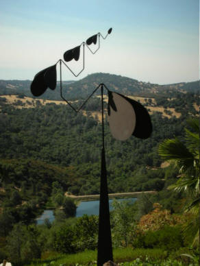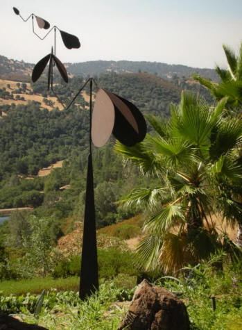 Four-tier kinetic aperture poised on pyramid base. Material is rusted steel. Overall dimension 15 foot heighth, 9 foot wingspan